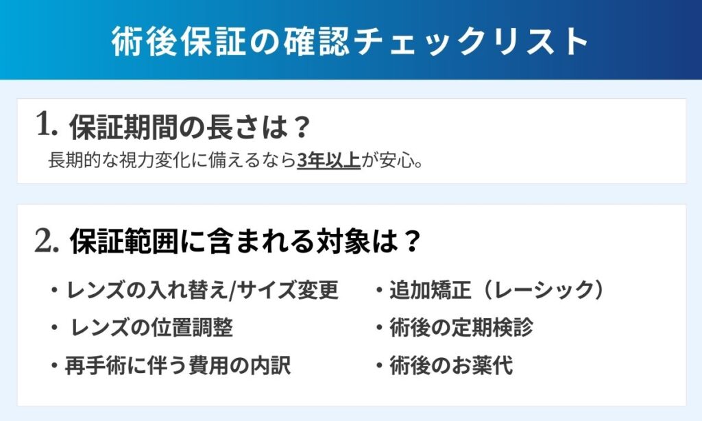 多くのクリニックでは1年〜3年の保証期間を設けています。数年後に白内障が進行したり、自身の近視が進んだりする場合もあります。長期的な視力変化までカバーしたいなら、3年以上の保証があるクリニックがおすすめです。