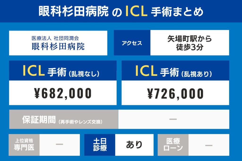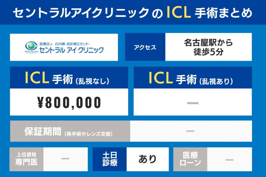 名古屋の各クリニックのアクセス、上位資格専門医の在籍有無、ICL手術費・検査費用、保証期間を比較してみましょう。