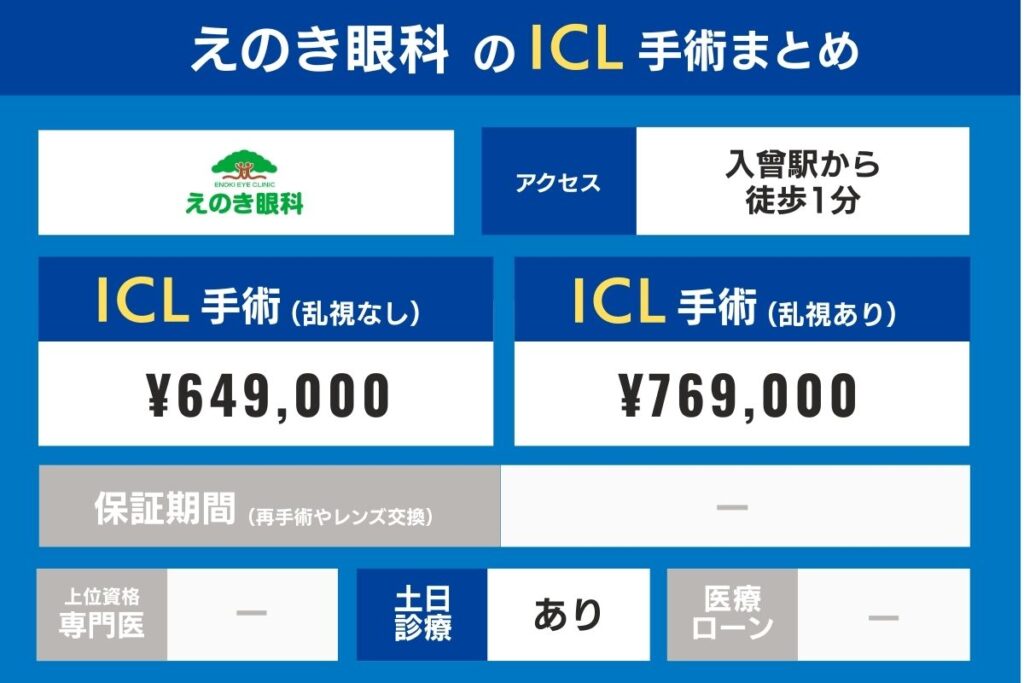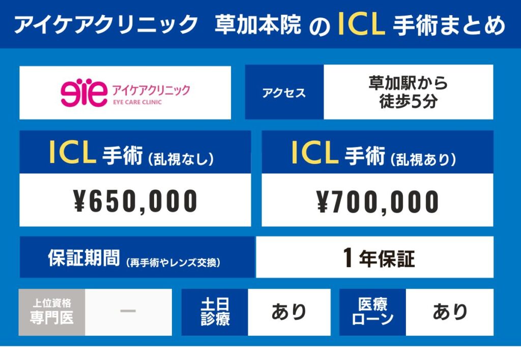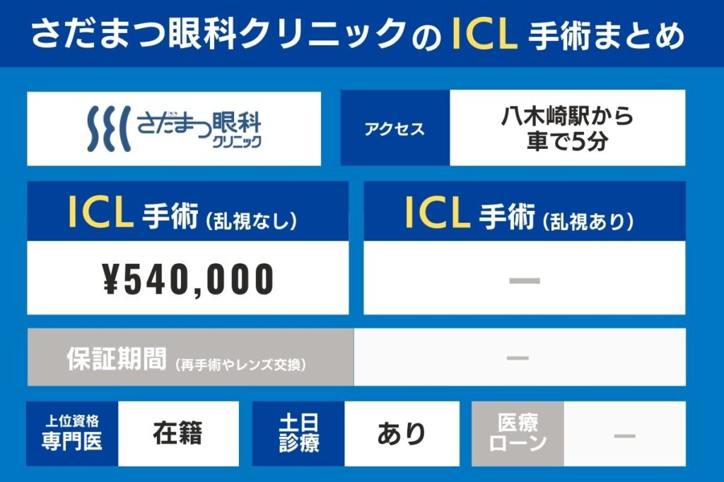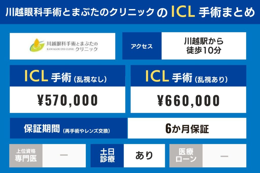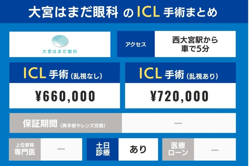 埼玉の各クリニックのアクセス、上位資格専門医の在籍有無、ICL手術費・検査費用、保証期間を比較してみましょう。